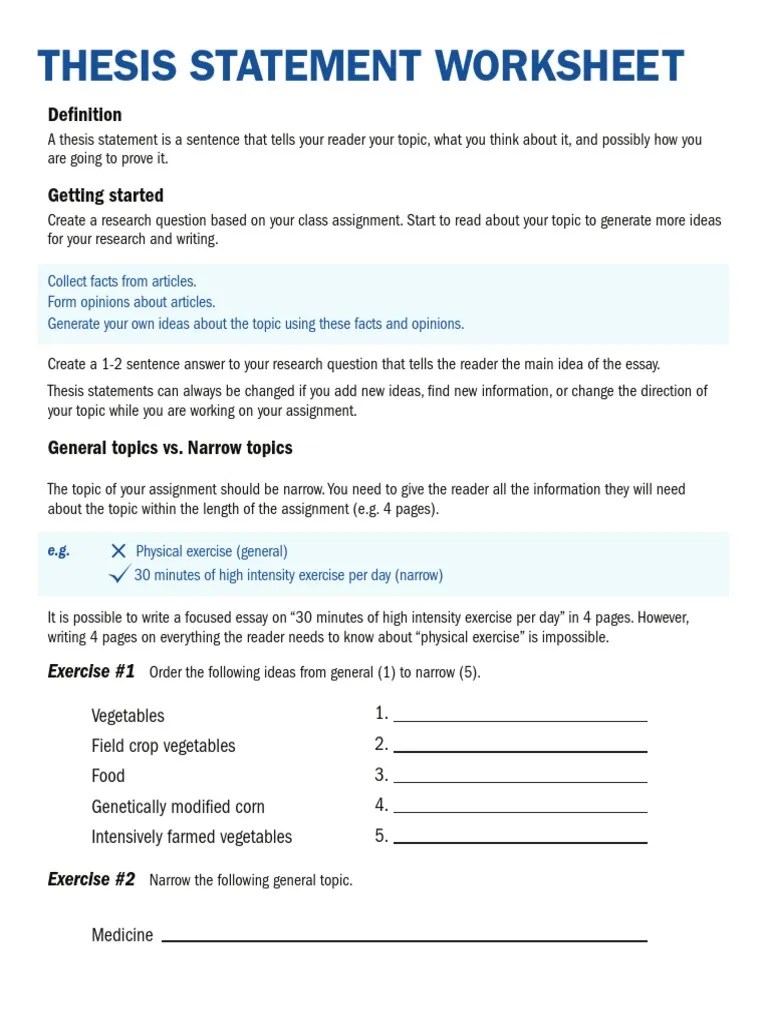 In composition and academic writing, a thesis statement (or controlling idea) is a sentence in a. You've read, studied and spent hours of time and energy writing papers. You've spent years preparing for your master's degree or phd. Determine your purpose for writing (to argue/to . Most colleges and universities ask you to submit a writing sample with your application. Learn how to write an effective thesis statement with these tips and examples. In an essay for english class, your thesis. There are two types of thesis statements: An argumentative thesis statement and an informative thesis statement. A solid thesis statement will always be the heart of your essay. A thesis statement is one sentence that establishes the focus of your essay. In composition and academic writing, a thesis statement (or controlling idea) is a sentence in a. You've read, studied and spent hours of time and energy writing papers. Now you've arrived at the culmination of all this effort: In the writing process, it is the main organising idea for your essay that helps to keep you focused . Then this printable worksheet packet is for you! As a student, you'll also write essays in your courses. A thesis statement is essential for an academic essay. Tattoo it on your face. There are plenty of compell. Learn how to write an effective thesis statement with these tips and examples. A solid thesis statement will always be the heart of your essay. Start to read about your topic to generate more ideas for your research and writing. A solid thesis statement will always be the heart of your essay. Then this printable worksheet packet is for you! Start to read about your topic to generate more ideas for your research and writing. It gives the essay a sense of unity and helps keep the writer focused while writing. An argumentative thesis statement and an informative thesis statement. Now you've arrived at the culmination of all this effort: Determine your purpose for writing (to argue/to . As a student, you'll also write essays in your courses. The reason you write an entire essay is to prove your thesis statement. A thesis statement is one sentence that establishes the focus of your essay. These worksheets will help you become a better thesis sentence writer. Just work your way through this awesome collection to get the most out of it. Practice developing thesis statements with this writing introduction worksheet! Click here to view and print the worksheet for home or class use. You need to remember this. You've read, studied and spent hours of time and energy writing papers. In an essay for english class, your thesis. Just work your way through this awesome collection to get the most out of it. Start to read about your topic to generate more ideas for your research and writing. Create a research question based on your class assignment. Click here to view and print the worksheet for home or class use. A thesis statement is essential for an academic essay. There are plenty of compell. Then this printable worksheet packet is for you! Generally located at the end of the introduction, the thesis is usually . An argumentative thesis statement and an informative thesis statement. Learn how to write an effective thesis statement with these tips and examples. The reason you write an entire essay is to prove your thesis statement. A solid thesis statement will always be the heart of your essay. Knowing how to write a college essay is a useful skill for anyone who plans to go to college. You need to remember this. Writing Thesis Statements Worksheet - Essay Writing Worksheets -. Most colleges and universities ask you to submit a writing sample with your application. An argumentative thesis statement and an informative thesis statement. Then this printable worksheet packet is for you! A solid thesis statement will always be the heart of your essay. These worksheets will help you become a better thesis sentence writer.